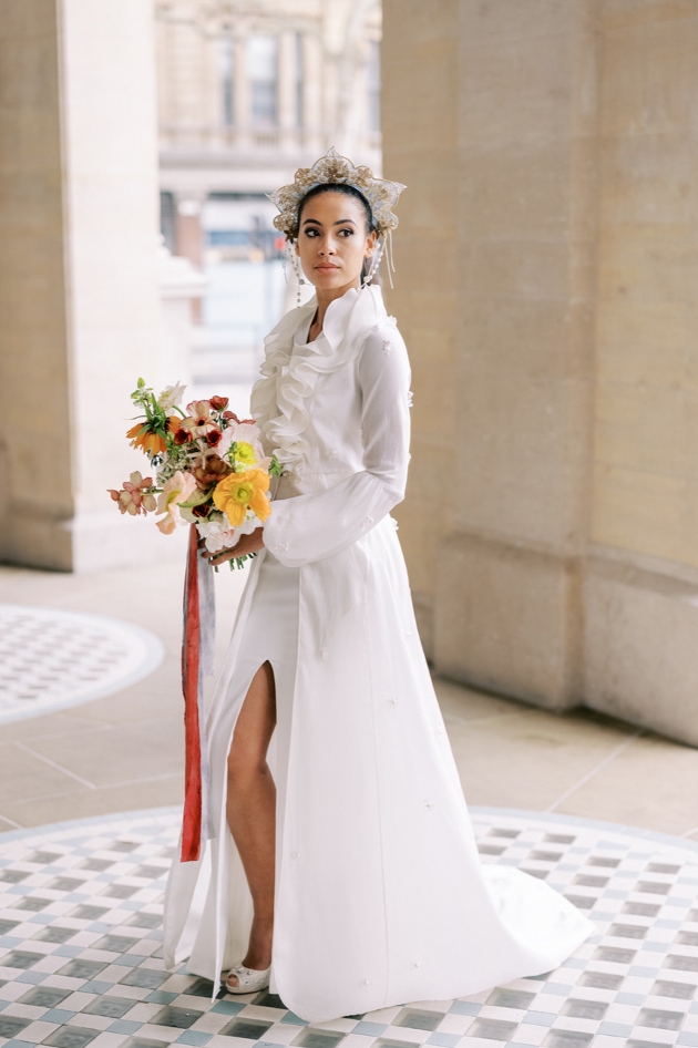 ong sleeved bridal coat worn by model holding orange and red bouquet and wearing headdress