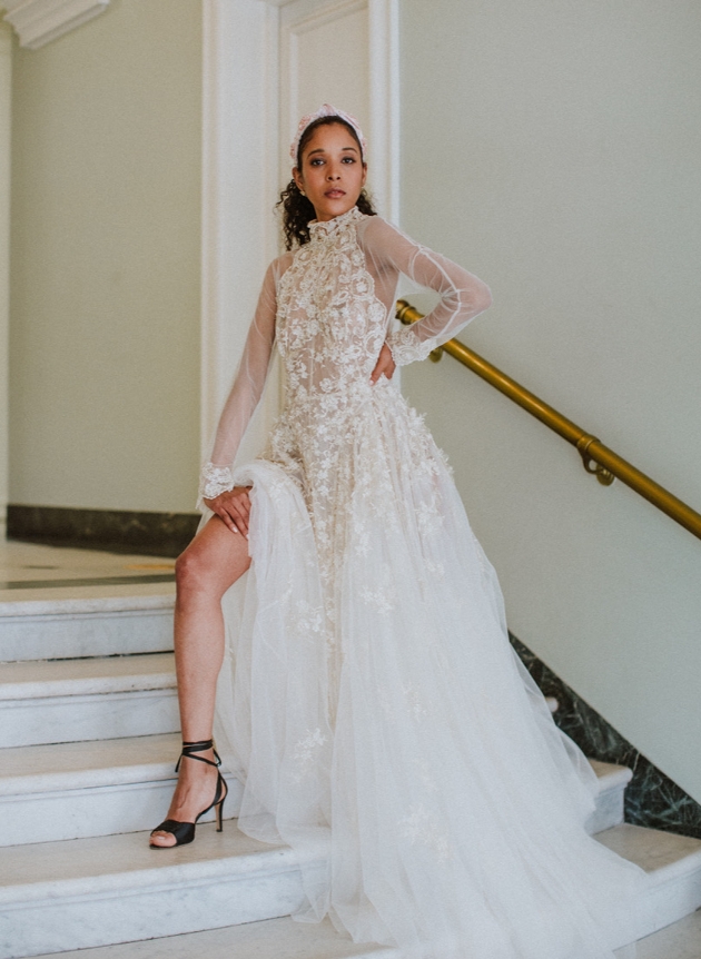 model in floral applique wedding dress slit to thigh on stairs