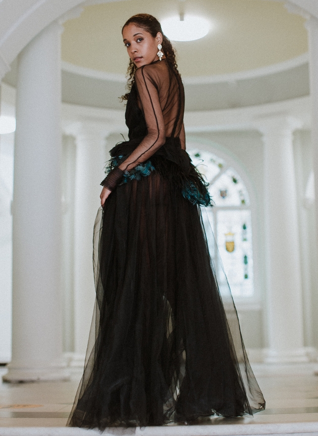 model in black coloured wedding dress with sheer back