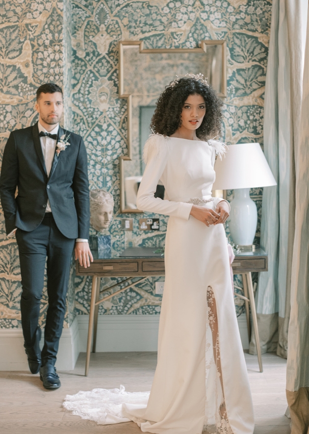 model in dress with feather capped shoulders groom in background