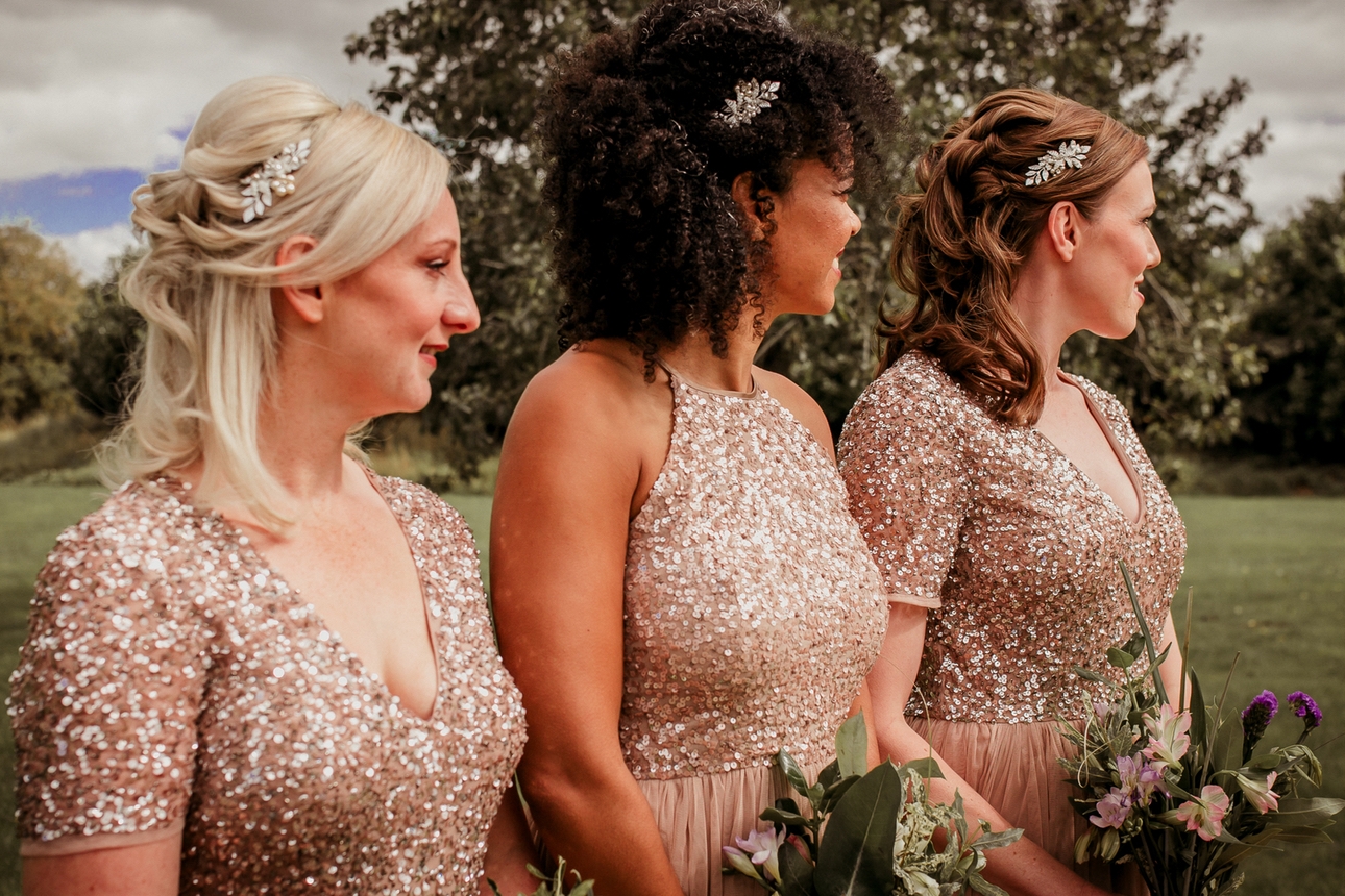 I also suggest coordinating bridesmaids' dresses and accessories and be flexible with a hairstyle that suits each bridesmaid. That way, everybody will feel comfortable on the day, which will make for some stunning photographs. The half up do (pictured) was created as part of our photo shoot to ensure that the hairstyle would withstand the wind and look perfect after the party had finished, but also showcase each of the different hair types.