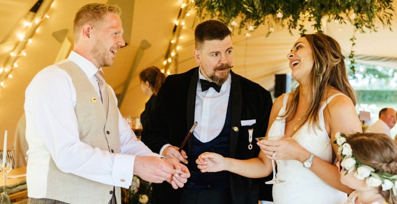 "Specialising in high-end, exclusive weddings across Essex, London, and Kent, I offer more than just mesmerising magic and sleight of hand. I have the privilege of being both a Master of Ceremonies and a wedding day host, ensuring that every part of your day flows smoothly from one magical moment to the next.