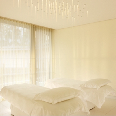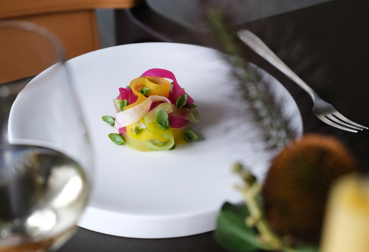 A light-filled conservatory with expansive views over the Berkshire countryside sits to one side of the pantry, offering an extension of the main restaurant space or an exclusive private dining setting for up to 12 guests. The main dining room seats 44 guests, with interiors that champion quality, craft and natural materials at every turn. As a centrepiece of the restaurant, a striking plaster relief set with root vegetables sits on the back wall, made by artisans Locker & Riley. There's also a contemporary light installation that mimics a woodland canopy, with delicate rays of light pouring over the restaurant below.