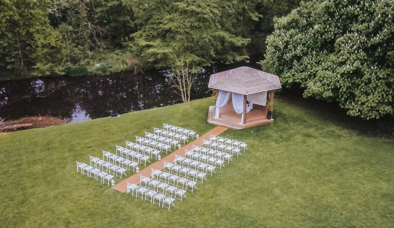 The Hall with its stunning mirrored wall and high ceilings can cater for up to 100 people. For larger weddings, up to 150, its garden and grounds marquee offer the perfect space. Alternatively, during the summer months you can choose to say your vows al fresco under the outdoor wedding gazebo situated next to the breathtaking backdrop of the lake.