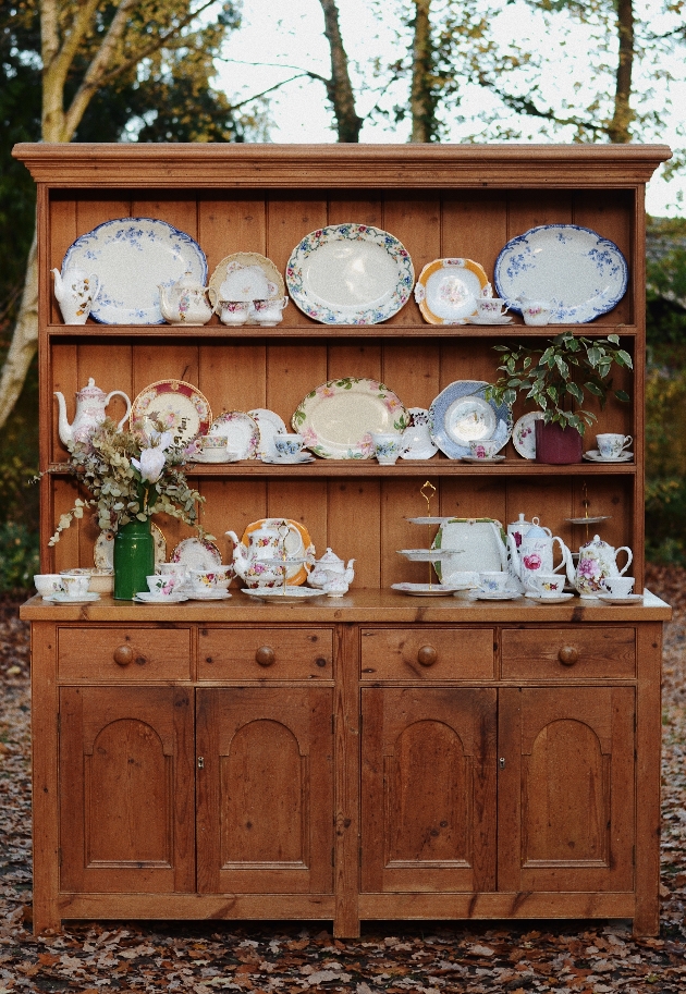The Vintage Dresser's collection includes other tableware and accessories, perfect for rustic-inspired, meadow or tipi weddings. Delightfully romantic, the vintage sweetie cart provides a fairytale touch and vintage glass jars and bon bon dishes filled with traditional sweets.