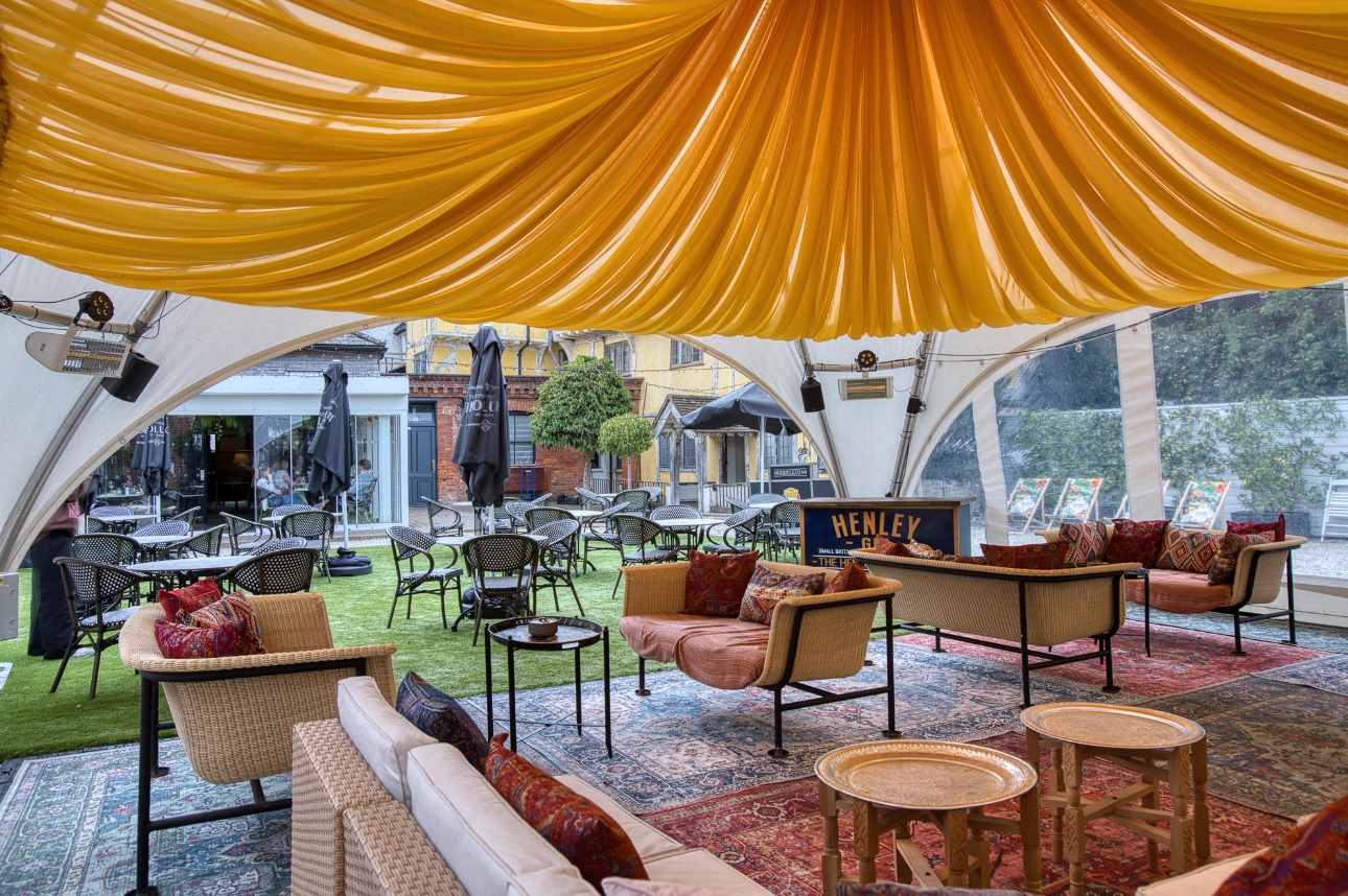 Set within the hotel's newly reimagined riverside courtyard space, The Henley Hideaway captures the spirit of summer with warm, Moroccan-inspired decor, plush colourful seating and firepits to stay cosy as the sun dips and the longer evenings linger.